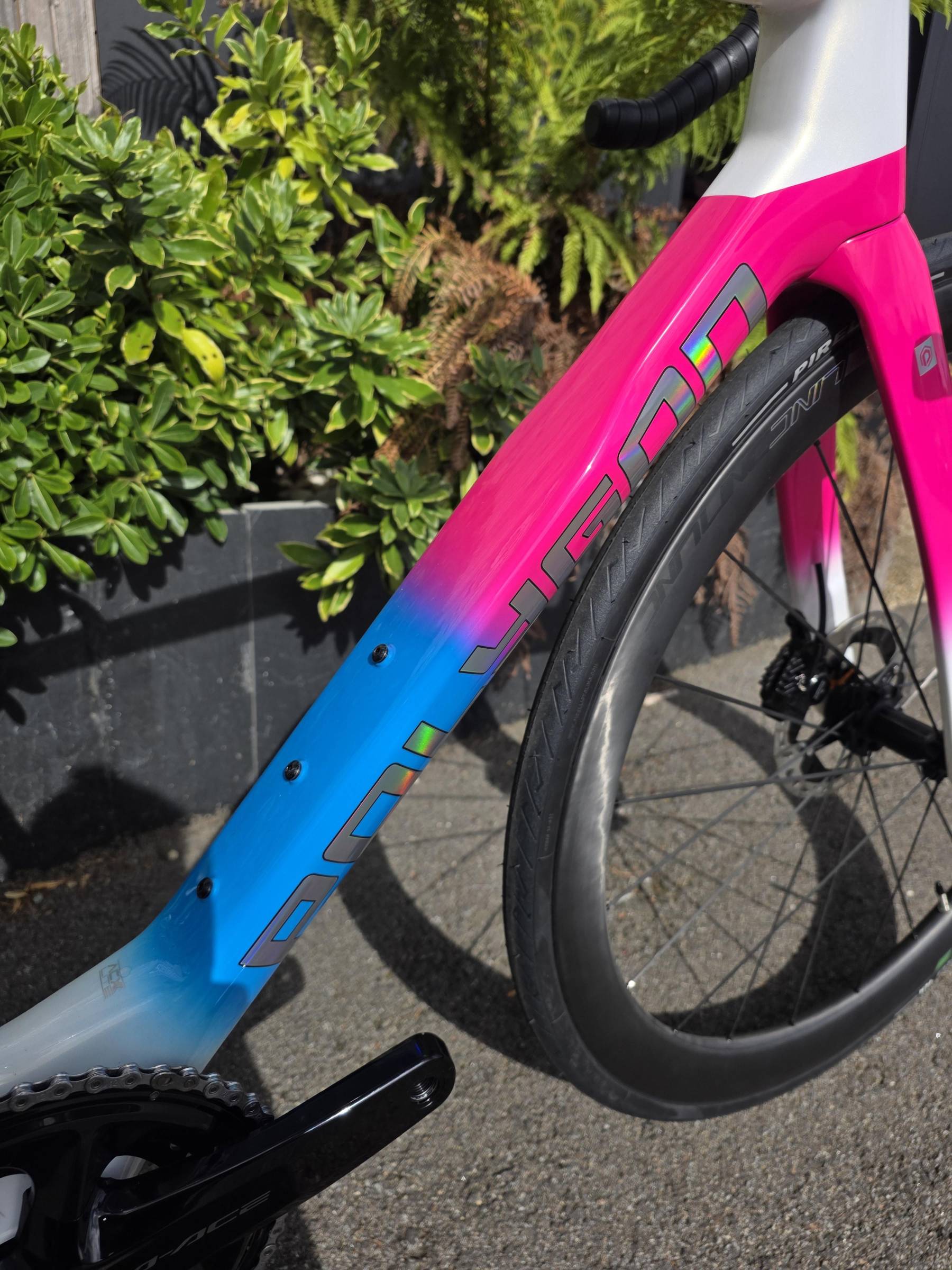 Équipement 100% haut de gamme, du cadre au groupe en passant par les roues.